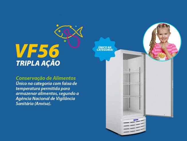 Na hora de preservar alimentos, não dá para abrir mão de segurança e qualidade. O VF56 é o único na categoria com faixa de temperatura adequada para armazenar alimentos, seguindo os requisitos da Agência Nacional de Vigilância Sanitária (Anvisa). Bastar escolher a função FREEZER.